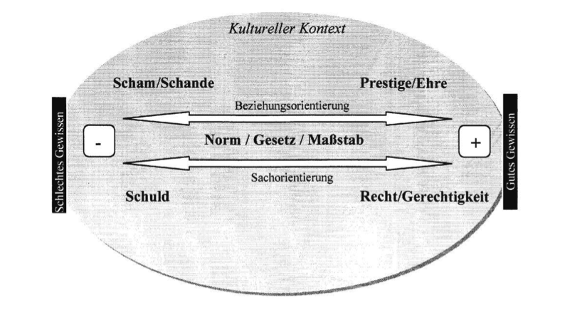 Vertretern aus Individualkulturen – also auch uns Deutschen – sagt man nach, dass sie ein stärkeres, sogenanntes „Schuldgewissen“ in sich tragen und Menschen aus Kollektivkulturen ein stärkeres „Schamgewissen“ haben. Kollektivgesellschaften werden aus dem Grund auch Schamkulturen genannt, da das „Gesicht-Wahren“ und „Nicht-Beschämt-Werden“ für sie existentiell wichtig ist. Individualgesellschaften werden auch Schuldkulturen genannt, weil ihnen sehr wichtig ist, dass das individuelle Recht gewahrt und die Schuldfrage stets geklärt wird.