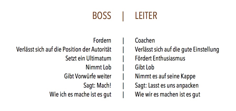 BOSS oder LEITER? Das ist die Frage 🙂 Gibt es überhaupt einen Unterschied? Das hängt sicher am Boss. Was unterscheidet einen »Ich bin der Chef« – Typ von einer guten Führungskraft, die Chef ist? Eine Liste, die eine nette Anregung zur Reflexion bietet, kommt hier: