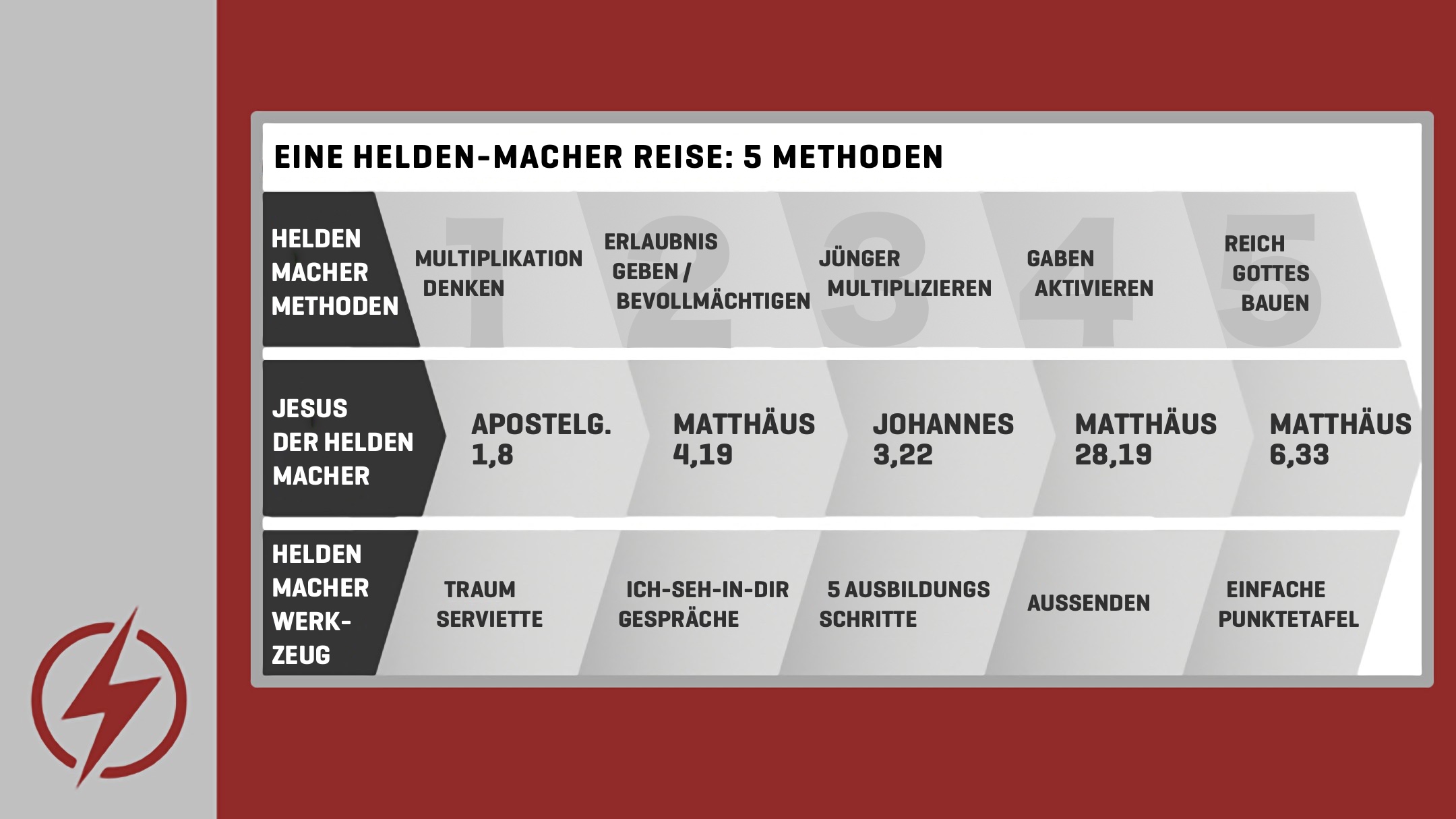 Die Frage im 5. Schritt zum »Hero Maker« lautet deshalb: Wie können wir mit »Normalos« einen dynamischen, sich selbst reproduzierenden Prozess auslösen, der als »Nebenprodukt« wachsende Kirchen hervorbringt? Das ist die einzige Perspektive, mit der die große missionarische Aufgabe Deutschland … angepackt werden kann, bei allem Respekt (und aller Dankbarkeit) für unsere dynamischen, inspirierenden, bekannten, großen … Kirchen. Sie heben das Niveau der Gemeinden insgesamt. Das ist gut.