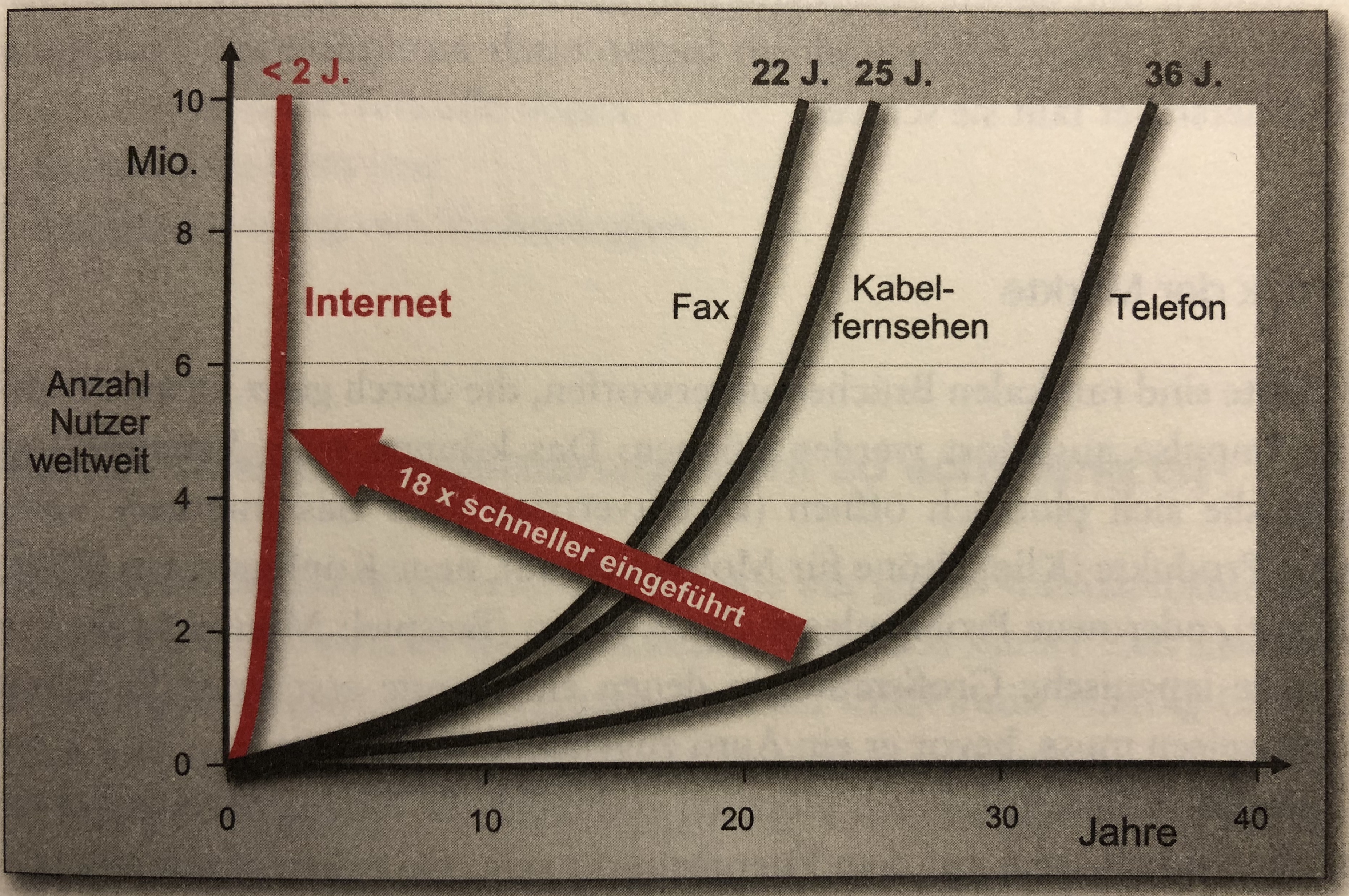 Das Internet hat 10 Millionen Nutzer 18x schneller erreicht, als es noch das Telefon schaffte. Anders gesagt: Wir hatten 36 Jahre Zeit, bis das Telefon eine breite Gesellschaftsschicht erreicht hat (meine Herkunftsfamilie hat noch bei den Nachbarn telefoniert!), das Internet brauchte nur noch schlappe 2 Jahre für die gleiche Reichweite. Neue Medien haben weiter an Geschwindigkeit zugelegt! Spannend, was noch kommen wird!!!