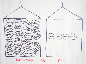 So viele Dinge tun Kirchen, um ihren Besuchern etwas zu bieten. Tolle Programm, Angebote und Aktionen. Bedürfnisse sollen gestillt werden. Aber ein einfacher und effektiver Weg, Menschen die zum Glauben finden auch zu hingegebenen Nachfolgern zu »machen«, ist für viele Gemeinden eine Mega-Herausforderung. Selbst in wachsenden, dynamischen jungen Kirchen ist das ein Problem. Besucher zu haben, ist nicht die höchste Hürde. Viele jungen Kirchen erleben einen sprunghaften Anstieg der Gottesdienstbesucherzahlen. Das beantwortet aber nicht zwingend die Frage, ob junge Christen zu Nachfolgern werden. Morgan illustriert das mit dieser Zeichnung …