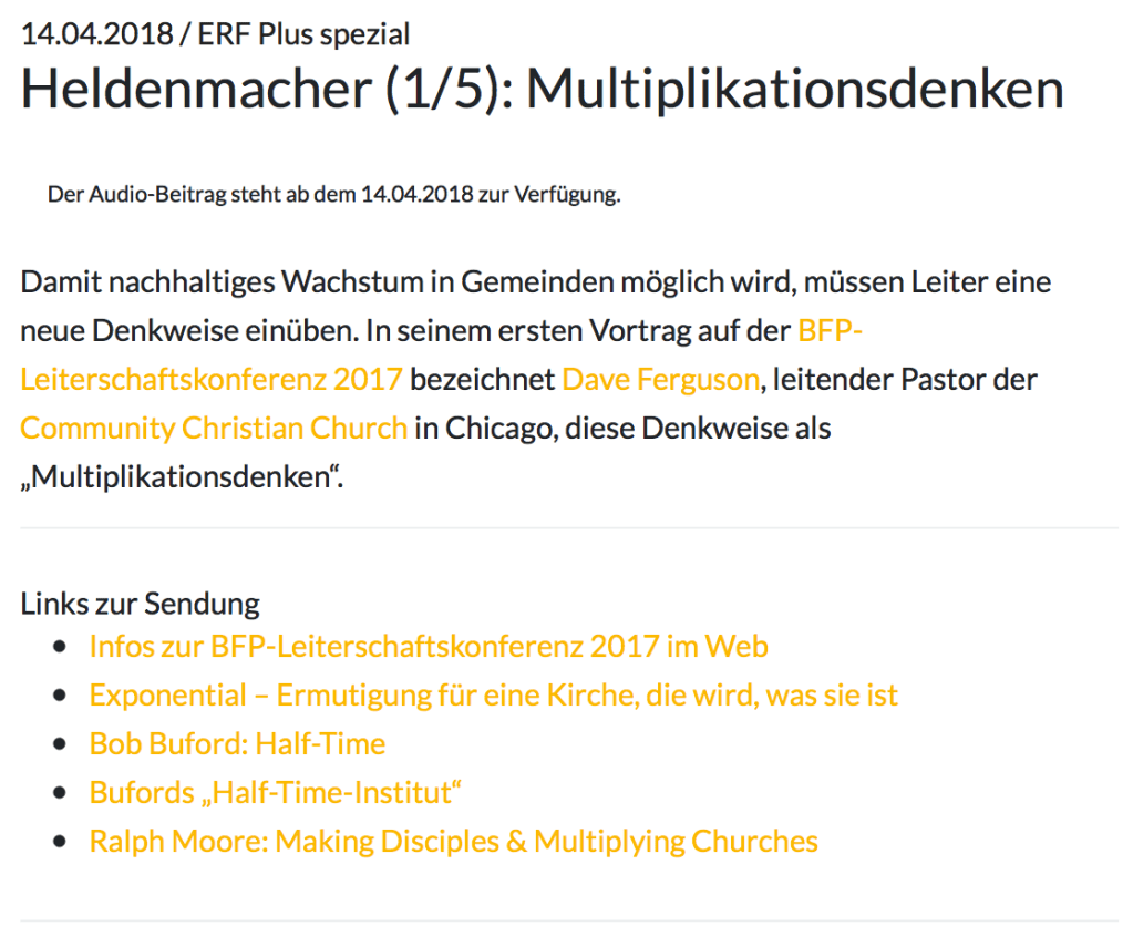 Auf der BFP Konferenz für Leiter hat Dave Ferguson das Material von »HERO MAKER«, (Heldenmacher) erstmals einer größeren Öffentlichkeit vorgestellt. Etliche weitere Konferenzen folgten. Die Resonanz war stark. Im März ist das dazugehörige Buch in den USA auf den Markt gekommen. Es soll das Zeug zum Bestseller haben. Nun sind die Vorträge von Dave Ferguson auf der BFP Leiterkonferenz im April und Mai im Radio zu hören.