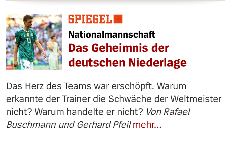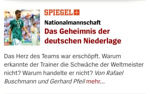 »Das Herz des Teams war erschöpft!« Das hatte ich bis dahin so noch nicht gelesen. Was damit wohl gemeint ist? Thomas Müller hatte noch gesagt, dass „Die Gründe vielfältig“ seien, die zum Ausscheiden geführt haben. Die Liste, die dann Experten aufstellten, wächst ja von Tag zu Tag: »Form, Fitness, Taktik, kein Hunger bei den Weltmeistern, Selbstherrlichkeit, die fehlende Mischung, fehlende Leidenschaft, Löw, Erdogan-Affäre, kein Leader, Risse im Team, falsches Quartier, …« und nun Herz!