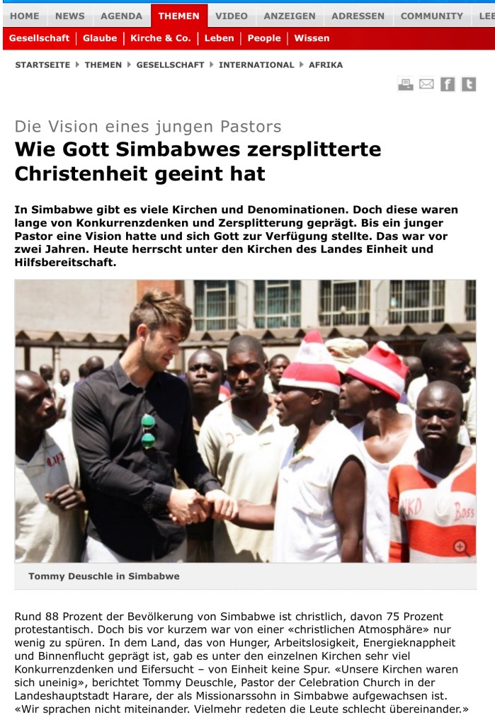 So sah Tommy Deuschle, Pastor der Celebration Church in Harare, die Sache auch. Er berichtet davon, dass Christen nicht nur nicht miteinander gesprochen haben, sondern dass sie sogar schlecht übereinander redeten! Damit wollte er sich nicht abfinden. Er wagte einen Schritt. Es braucht immer eine Person, die sich mit dem Status Quo nicht abfinden will und deshalb den ersten Schritt wagt. Was dann passierte, wird hier auf livenet.ch berichtet: