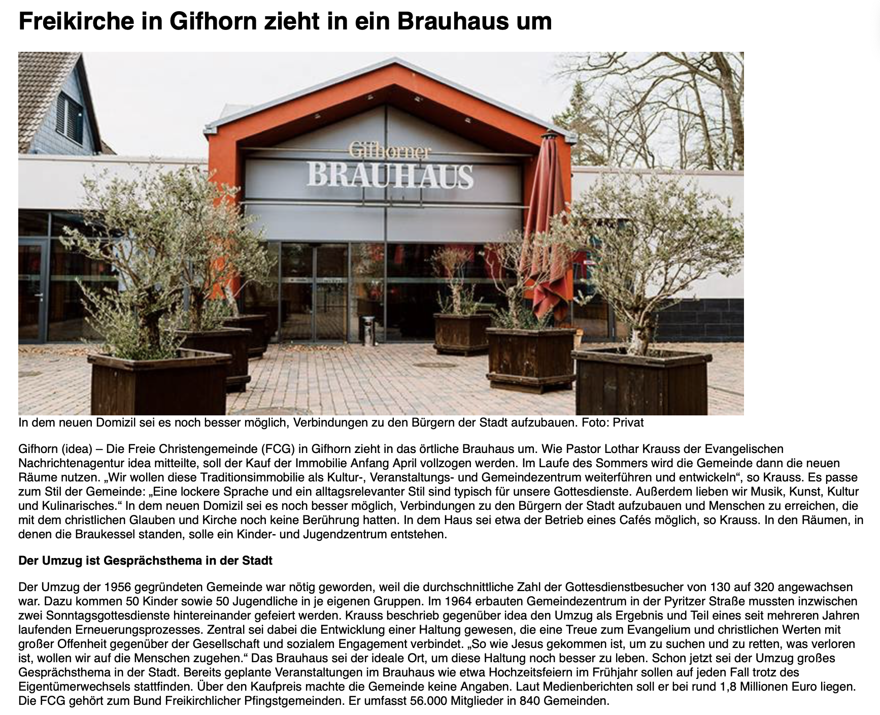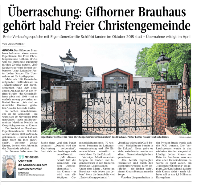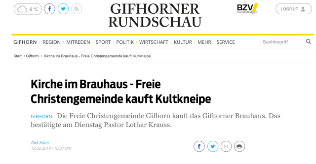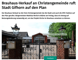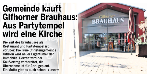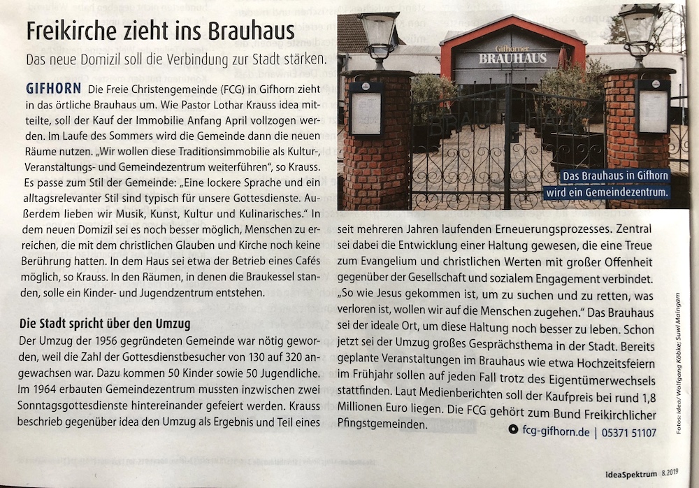 Auch in der Schweiz wird die »FCG – BRAUHAUS-SACHE« beachtet. Das große Webportal „Livenet.ch“ berichtet hier. Ich habe den Redakteur direkt darauf hingewiesen, dass einige Aussagen so nicht zutreffen. Zum Beispiel ist der Vertrag noch nicht unterschrieben, sondern wird erst vorbereitet. Auch gab es in Gifhorn lange vor uns starke geistliche Aufbrüche. Ich denke dabei an die Gottesdienste spontan innerhalb der Evangelischen Landeskirche in Verbindung mit dem Marburger Kreis … Und natürlich geht es der FCG im Brauhaus um Jesus. Und deshalb auch um Begegnung, Lebensfreude, Kunst, Kultur, Kulinarisches, Musik, Literatur, Gesellschaft, Wirtschaft … Wir wollen im BRAUHAUS keine Verengung, sondern den weiten Horizont sehen. Warum? Mit Christus im Zentrum eröffnet sich immer ein weiter Horizont, der alle Bereiche des Lebens berührt! Das soll die FCG im BRAUHAUS prägen. Das soll ein Segen für Gifhorn sein.