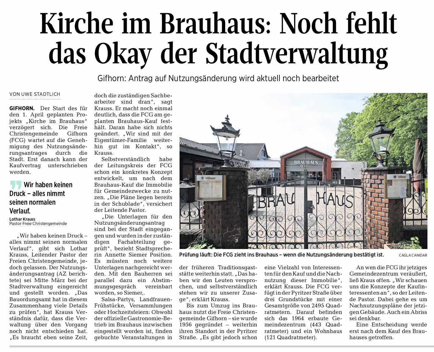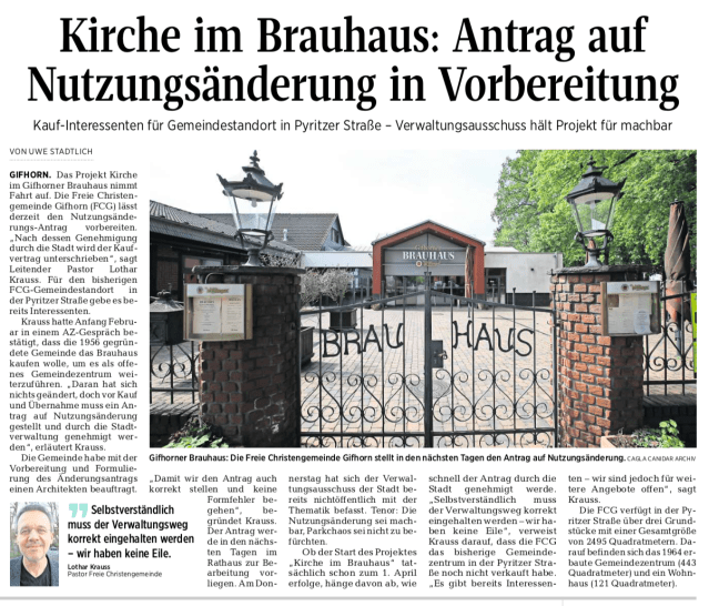 Gifhorn. Von Uwe Stadtlich „Wir haben keinen Druck – alles nimmt seinen normalen Verlauf“, gibt sich Lothar Krauss, leitender Pastor der Freien Christengemeinde, jedoch gelassen. Der Nutzungsänderungsantrag(AZ berichtete) sei Mitte März bei der Stadtverwaltung eingereicht und gestellt worden. „Das Bauordungsamt hat in diesem Zusammenhang viele Details zu prüfen“, hat Krauss Verständnis dafür, dass die Verwaltung über den Vorgang noch nicht entschieden hat. „Es braucht eben seine Zeit, doch die zuständigen Sachbearbeiter sind dran“, sagt Krauss. Er macht noch einmal deutlich, dass die FCG am geplanten Brauhaus-Kauf festhält. Daran habe sich nichts geändert. „Wir sind mit der Eigentümer-Familie weiterhin gut im Kontakt“, so Krauss.