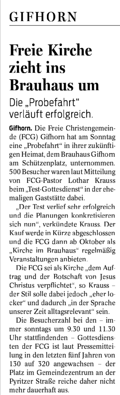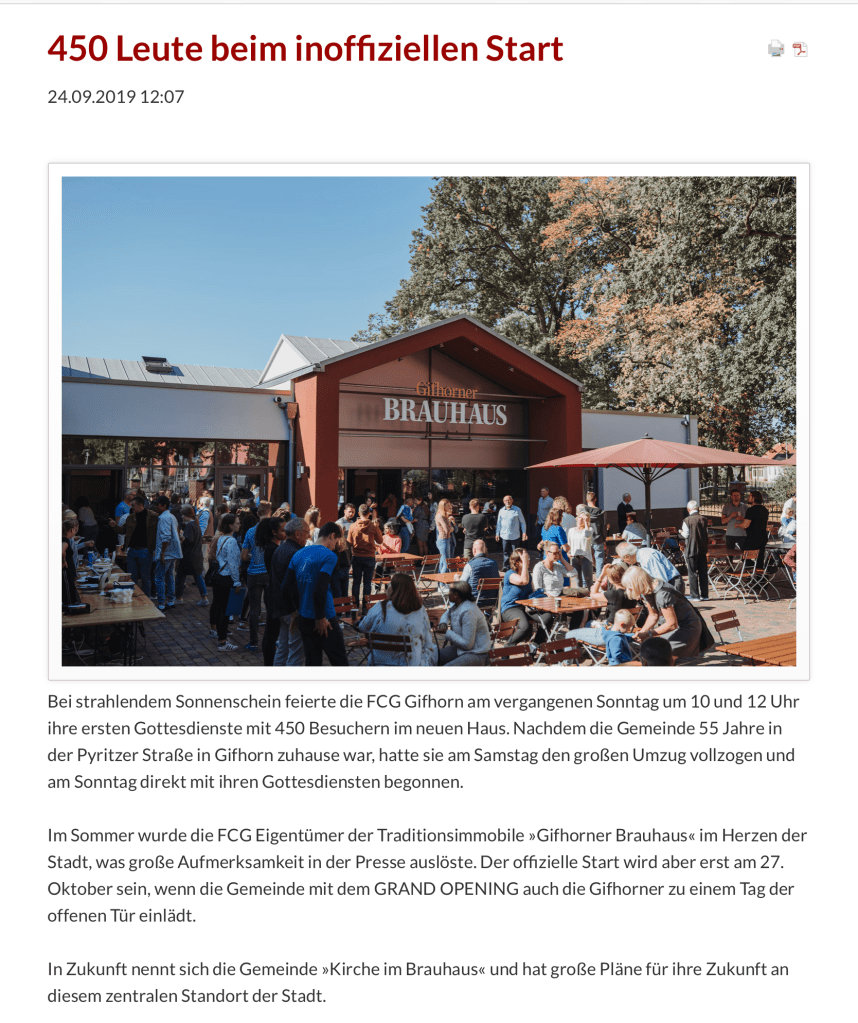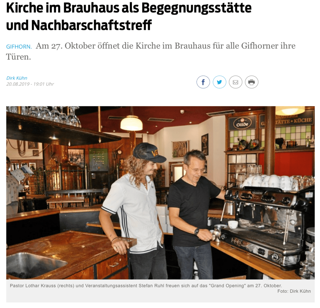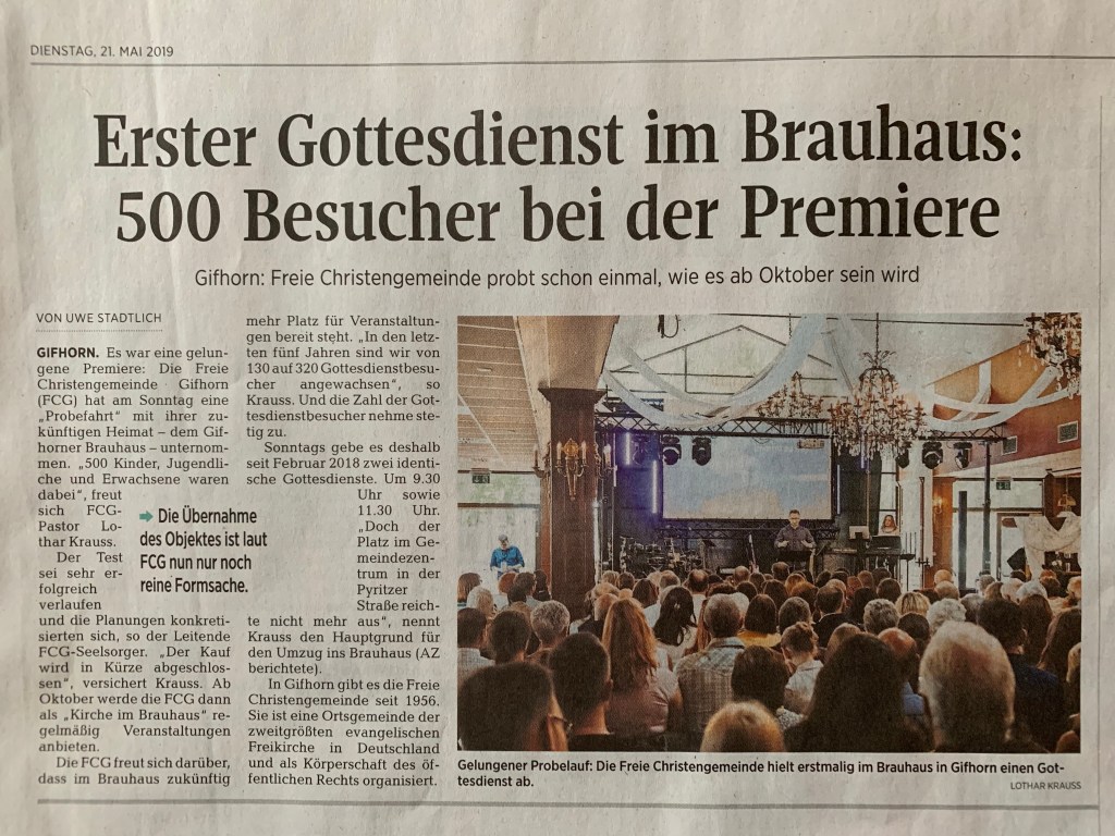 Update: 21. August 2019. Die Gifhorner Rundschau berichtet in ihrer heutigen Ausgabe über den Fortgang des FCG Abenteuers: »Kirche im Brauhaus«. Es ist genial, wie die Presse uns als Church, in der ich als einer der Pastoren mitarbeiten darf, auf dem Weg ins Brauhaus begleitet. Und die FCG ist super dankbar, für die unabhängige, aber sehr faire Berichterstattung, die auch in den weiteren Ausgaben in Wolfsburg, Braunschweig, Wolfenbüttel … erscheint. Hier der Bericht: