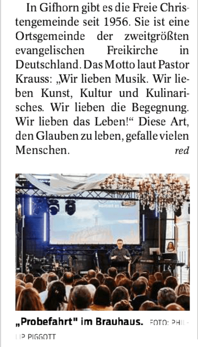 Das alles ist für uns als FCG ein Vorgeschmack. Eine tolle Geschichte wird gerade in Gifhorn geschrieben, von der wir schon hier berichtet haben. Die Gemeinde hat einen wichtigen Prozess der Veränderung durchlaufen und setzt Kurs auf eine grandiose Zukunft. »Kirche im Brauhaus« – Wir lieben das Leben! ist unser Motto. Wir wollen – als ein Teil der christlichen Gemeinschaft, die aus vielen Kirchen, Gemeinden und Gemeinschaften besteht – zu einem Geschenk für Gifhorn und die ganze Region werden.