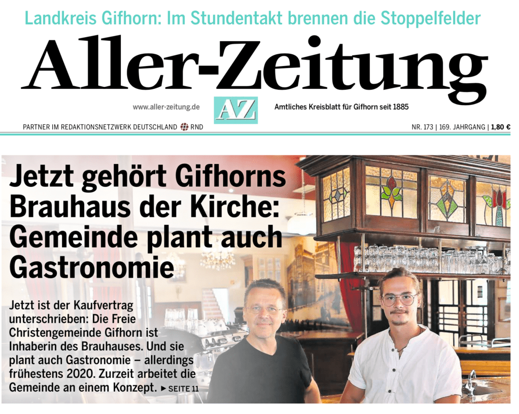 Update vom 27. Juli 2019: Die Aller Zeitung berichtet in ihrer heutigen Ausgabe über unsere Pläne, Träume und Gedanken zum Brauhaus. Was für ein Abenteuer, in das uns der Himmel hineingeführt hat. Und immer gebraucht er Beweger, die gemeinsam ein Team bilden und ein Risiko eingehen. Den ganzen Bericht gibt es in der heutigen Aller Zeitung (Print oder online) oder hier.