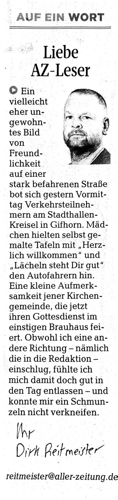 Hier geht es zum Bericht über den ersten Gottesdienst, den die Aller Zeitung in Ergänzung zur Kolumne gebracht hat.