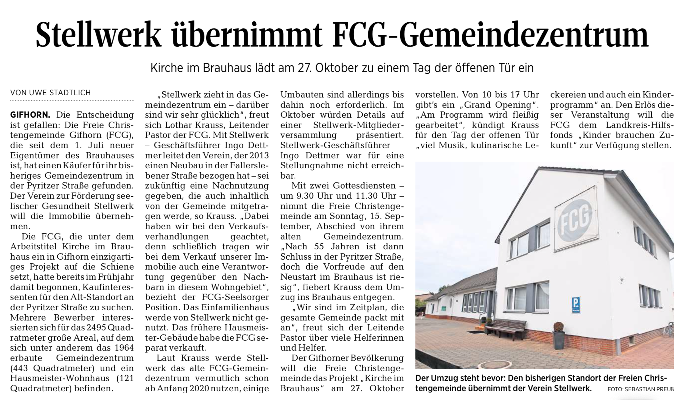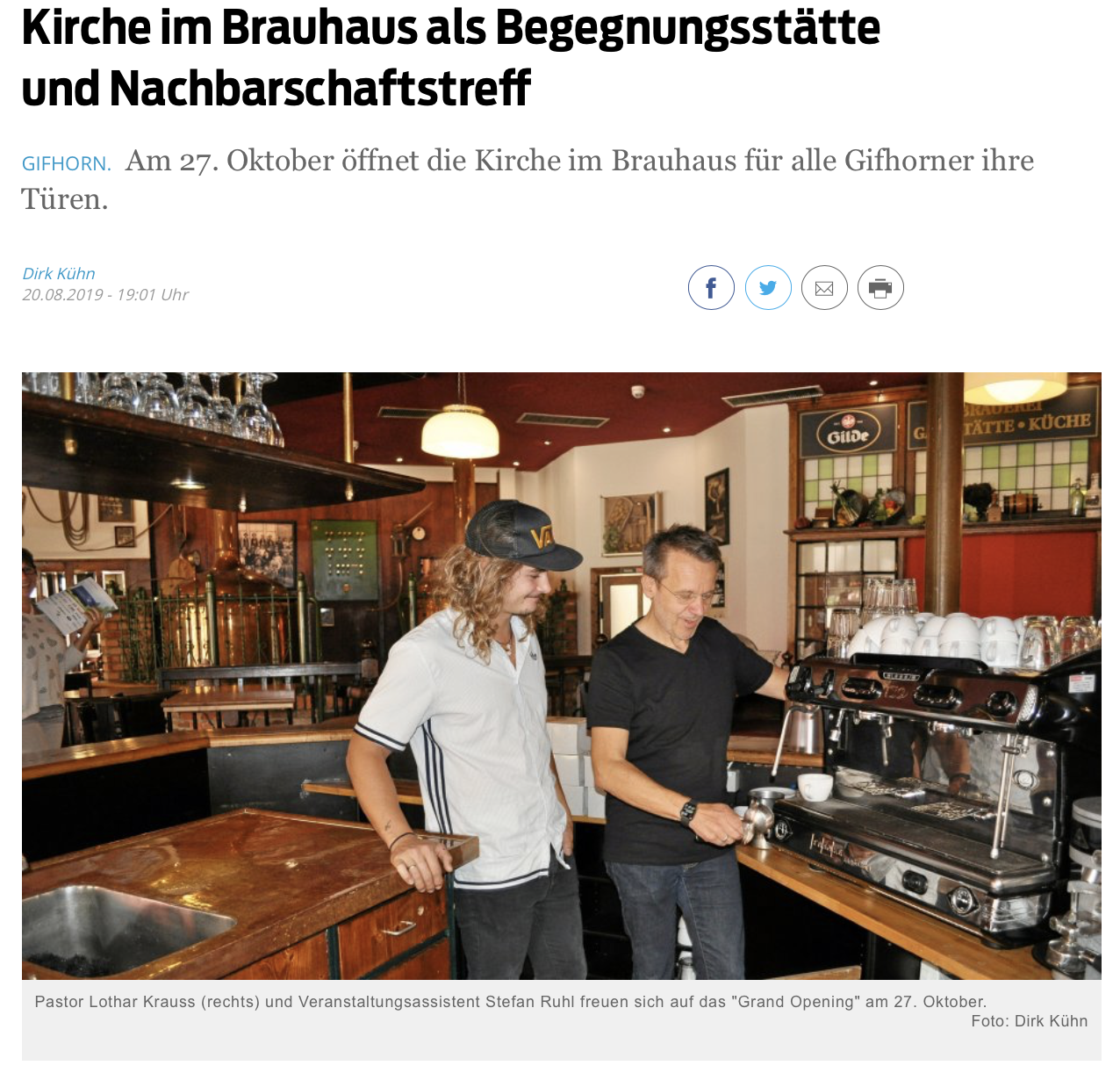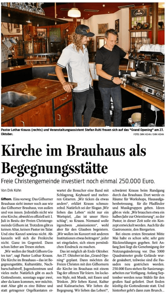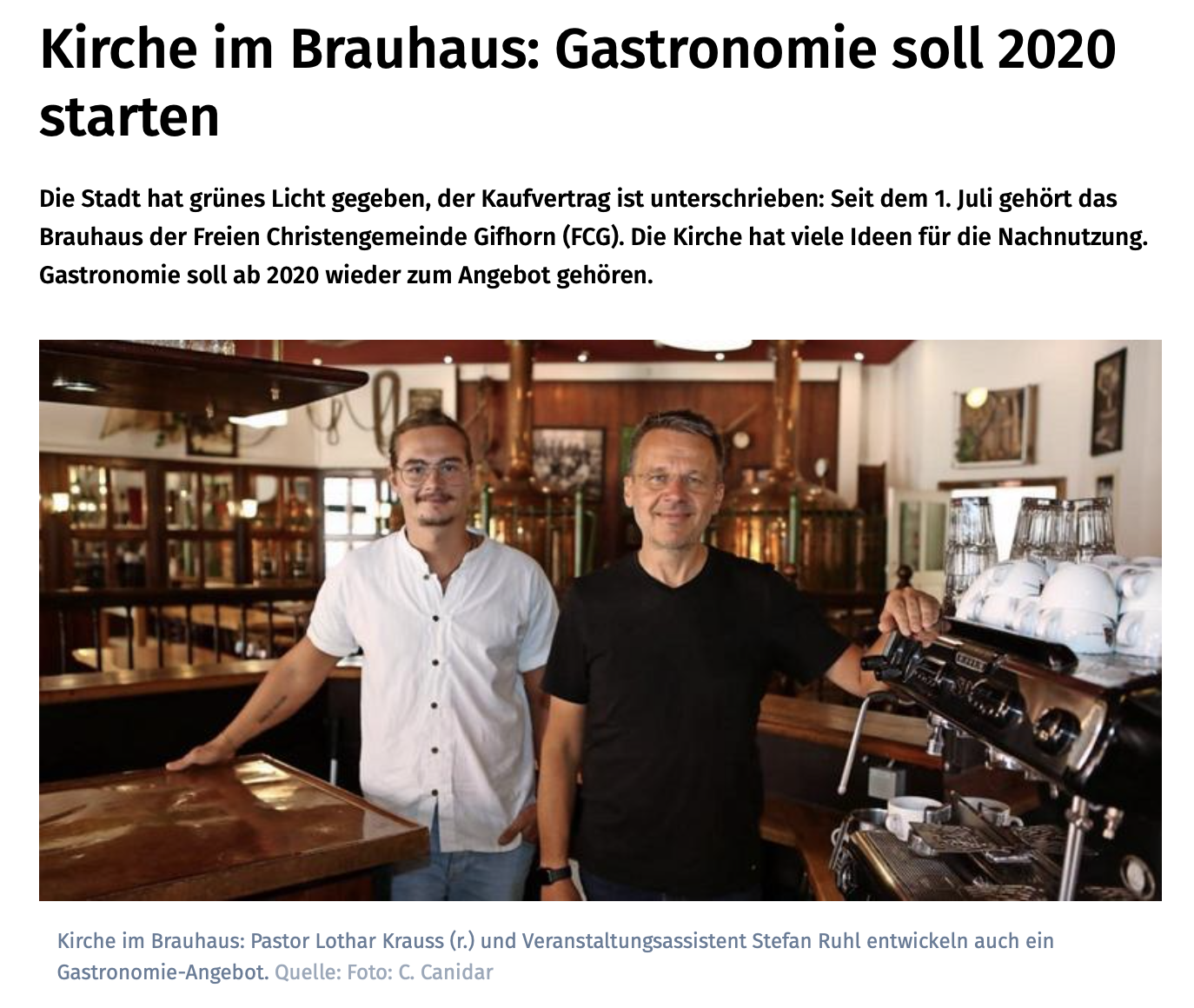 Update: 21. August 2019. Die Gifhorner Rundschau berichtet in ihrer heutigen Ausgabe über den Fortgang des FCG Abenteuers: »Kirche im Brauhaus«. Es ist genial, wie die Presse uns als Church, in der ich als einer der Pastoren mitarbeiten darf, auf dem Weg ins Brauhaus begleitet. Und die FCG ist super dankbar, für die unabhängige, aber sehr faire Berichterstattung, die auch in den weiteren Ausgaben in Wolfsburg, Braunschweig, Wolfenbüttel … erscheint. Hier der Bericht: