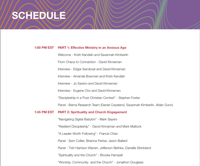 Das sehr bekannte und geschätzte BARNA Institut steht hinter der Forschungsarbeit, die am 10. September in diesem Webinar vorgestellt wird. Danielle Strickland, Jo Saxton, Dr. Krish Kandiah, Christine Caine, Francis Chan sind nur einige der Leute, die dabei zu Wort kommen werden, um auf die Einsichten der Studie zu reagieren. UPDATE: Welcher Redner greift zu welcher Zeit welches Thema auf? Die Übersicht steht am Ende des Posts bereit.