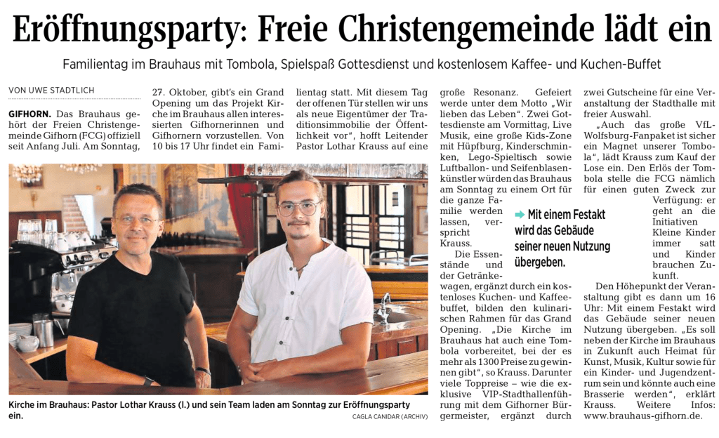 Update: 24. Oktober. Aller Zeitung. Nur dass wir nicht mehr Freie Christengemeinde heißen, sondern KIRCHE IM BRAUHAUS. 😁 Aber das tut dem tollen Beitrag keinen Abbruch …