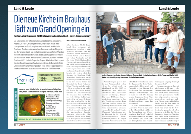 Das Szene-Magazin liegt in der ganzen Stadt kostenlos aus. Es ist sehr bekannt und wird gerne gelesen. Es ist eine Ehre für uns, dass wir dort mit unserer – zugegeben – ungewöhnlichen Idee einer Kirche im Brauhaus (ab Seite 16) portraitiert werden!