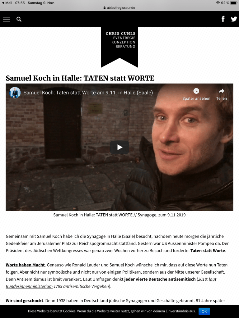 Der 9. November ist ein Datum mit besonderer Bedeutung in Deutschland. Wir dürfen nicht schweigen, uns ins Private zurückziehen und wegschauen. Leiter sind Beweger, die Verantwortung übernehmen. Das tun auf ihre Art Samuel Koch und Chris Cuhls an diesem 9.11. Sie haben eine spezielle Botschaft und Aktion an diesem Tag vorbereitet, von der Chris auf seinem Blog berichtet: