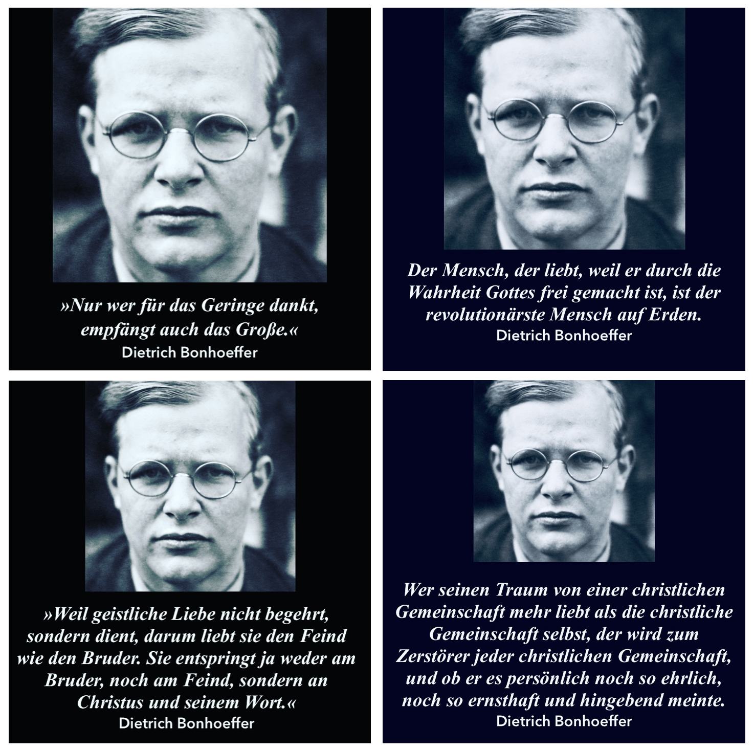 Die Arbeiten von Dietrich Bonhoeffer inspirieren und begleiten mich seit Jahrzehnten. Nach und nach vervollständigte sich die Werkausgabe seiner Schriften in meiner kleinen Bibliothek. Besonders schätze ich an Bonhoeffer, wie prägnant und treffend er die Dinge auf den Punkt bringt. Richtige kleine Powerriegel bietet er. Wenige Seiten in seinen Büchern geben mir mehr Denkstoff, als ganze Bücher anderer Autoren es vermögen. Hier eine kleine Kostprobe: