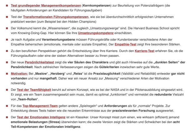 Allgemeinverständlich stellt der Prof. seine Einsichten – eben ergänzt durch richtig viele Tests – kostenlos für den Privatnutzer – im Netz bereit. Sie sind auf ihre Reliabilität und Validität gecheckt, man kann mit ihnen arbeiten 👊. Auf alle Fälle sollte man sich diese Adresse »bookmarken«. Hier geht es zum Angebot seines Instituts für Management-Innovationen.
