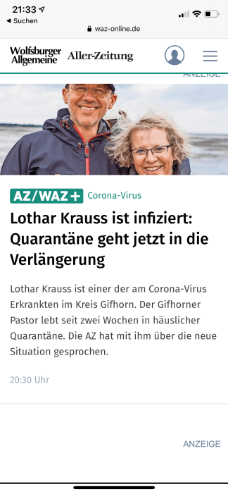 Gegen Mittag rief dann unverhofft die Chefredakteurin der regionalen Zeitungen aus Wolfsburg, Peine und Gifhorn bei mir an. Die Chefin persönlich. Eine total nette Frau! Was habe ich erwartet? Ihr Gedanke: Der Beitrag, der vor 2 Tagen zu unserer Quarantäne erschien, geht steil. Für das Wochenende würden sie gerne ein Update bringen. Nächste Woche noch einen Text zum Abschluss. Ich hoffe, dass die Zeit dann abgeschlossen ist! Denke ich mir. Aus dem Telefongespräch, das viel Spaß macht, wird ein schöner Artikel. Am frühen Abend geht er online. Heute ist er in den Printmedien.