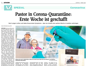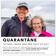 Das Interview ist total nett und witzig. Wir lachen viel. Der Redakteur ist klasse. Und ja, unsere missliche Lage kann für andere etwas Gutes bringen. Der Blick hinter die Kulisse entspannt, klärt und zeigt Wege auf, wie das gelingen kann. So eine Quarantäne. Die Reflexion, zu der uns das Gespräch anregt, ist gut. Tut gut. Wir sind danach aufgeräumter. Uns ist einmal mehr klar, welches Vorrecht wir haben. Wie beschenkt wir sind. Von Gott. Von Menschen. Auch im Moment der Isolation. Der Glaube trägt. Schon in der heftigen Krebsphase ist das unsere Erfahrung. Wir werden getragen!