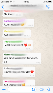 »Wir sind im Gebet bei euch! Ist es nicht der Hammer, dass die Unterstützung, die ihr jetzt erfahrt, nicht nur im Vorfeld leere Versprechungen waren, sondern jetzt wirklich Realität? Gott ist unser genialer Versorger und es ist der Hammer, mit welcher Großzügigkeit er uns hilft und versorgt. Jetzt empfangen wir (als eure Freunde) nicht nur Segen, sondern haben auch erneut die Chance ein Segen für euch zu sein. Gott ist gut!«