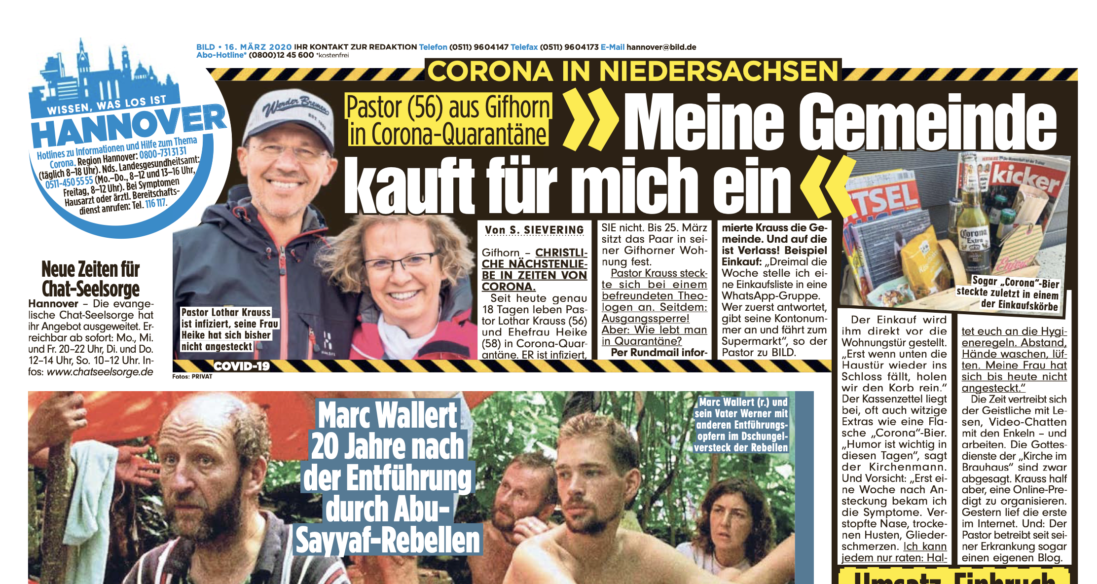 Anfragen. Produktionsgesellschaften, die für öffentlich-rechtliche TV Sender arbeiten, fragen an. Wollen Interviews. Bilder einfangen, für die täglichen Magazinsendungen. Dass die BILD berichtet hat, führt alles auf NEXT LEVEL. Ich lerne die Dynamiken des Marktes kennen. Darf mich nicht täuschen. Storys werden gesucht. Jetzt. Möglichst mit Effekt. Pastor. Positiv. Quarantäne. Ich will jetzt kein Corona-Star werden. Was sonst? Einblick geben. Mut machen. Authentisch berichten. O.k. Hab ich gemacht.