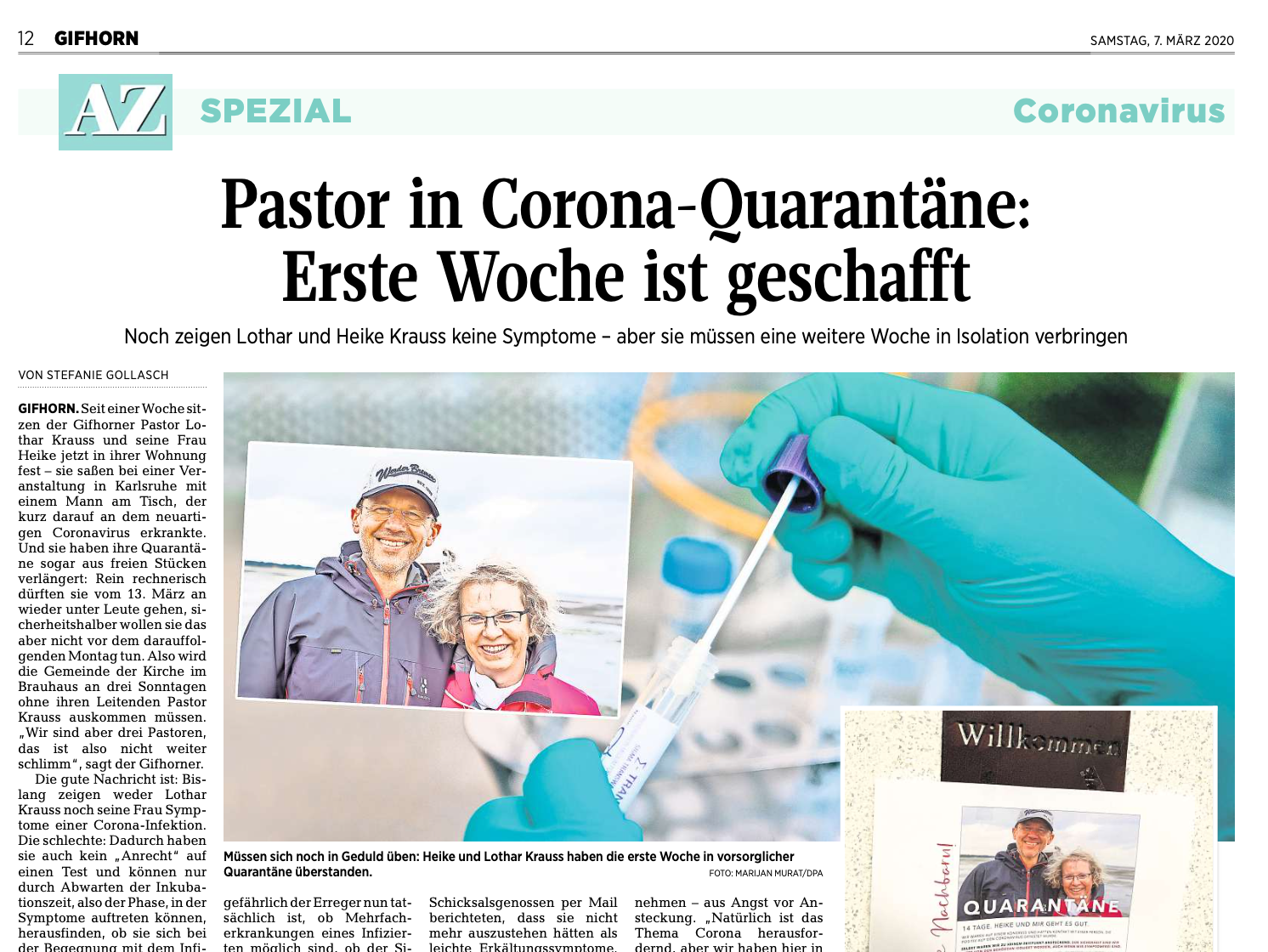 Wie geht es Ihnen, Herr Krauss! Das ist schon eine Überraschung, als am Vormittag ein Anruf aus der Redaktion der Aller Zeitung in Gifhorn kommt. Ob sie über unser Erleben in der Quarantäne berichten könnten. Will ich das? Macht das Sinn? Ich bin mir zunächst nicht im Klaren darüber.