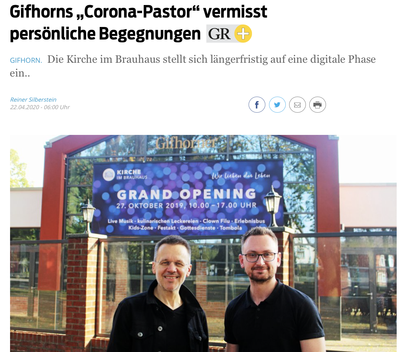 Das war ein Tag – gestern! Viele Anrufe, Nachfragen und liebe Gesten. Wieder ein Bericht zu uns. Gifhorner Rundschau: »Gottesdienste kommen per Youtube ins Wohnzimmer. Die Kirche im Brauhaus wird durch Corona vorübergehend zur Kirche zuhause.« Meine Kollegen machen einen klasse Job. Ich bin so beschenkt! Wir als Kirche sind so beschenkt. Dankbarkeit brandet in mir auf!