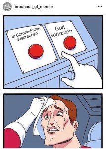 Und dann erreichen mich Nachrichten, die mich traurig machen. Ich kann nichts daran ändern. Wieder diese Ohnmacht. Panik erfasst viele Leute im Blick auf mögliche Risiken. Jemand schickt mir ein humorvolles Bild. Panik. Nee, das ist nicht mein Ding. Der Glaube, der vor über 40 Jahren mir geschenkt wurde, hat Wege. Immer. Ganz gleich was kommt. Jesus kennt alles. ER kennt sich aus. Immer. Und überall. Das trägt! Auch jetzt.