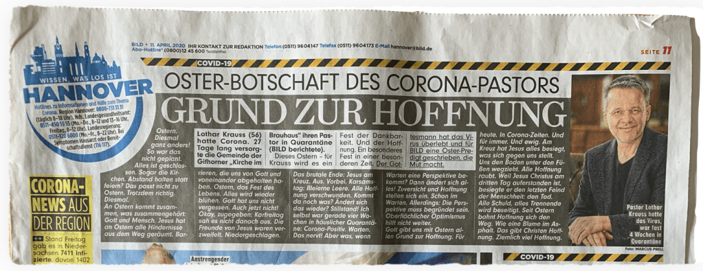 Weil ich zu den sehr früh Infizierten gehöre, hatte die Presse schnell Interesse an mir. Die Lokalzeitungen, dann auch Medien überregional. Radio. TV. Magazine. Darunter auch der Kontakt zur BILD Zeitung, Büro Hannover. Die Kontakte zu den Redakteuren, Reportern und Journalisten gestaltete sich durchweg sehr angenehm. Richtig nette Gespräche waren das, tolle Kontakte ergaben sich. Auch mit dem Chefreporter von BILD Hannover. Und er kam auf die Idee, ob ich nicht als Betroffener und Pastor eine Kurzpredigt für die Osterausgabe schreiben wolle.