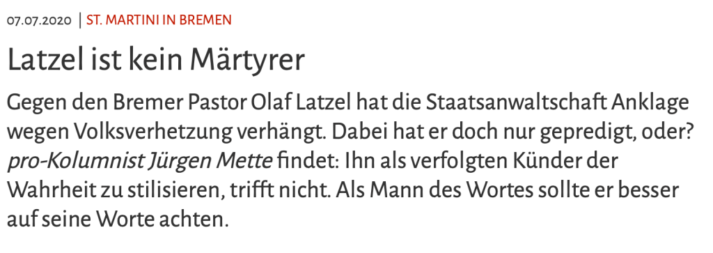 Jürgen Mette schreibt jede Woche im Christlichen Medienmagazin pro eine Kolumne. Mal mit spitzer Feder, mal mit Augenzwinkern, mal ernst. So wie es Jürgen eben sieht. Wie zu erwarten schrieb er auch zu Olaf Latzel, dem Bremer Pastor, gegen den die Staatsanwaltschaft Ermittlungen wegen Volksverhetzung eingeleitet hat. Und Jürgen setzte poientiert Akzente. Schon die Überschrift war herausfordernd für manche Leser: »Latzel ist kein Märtyrer«