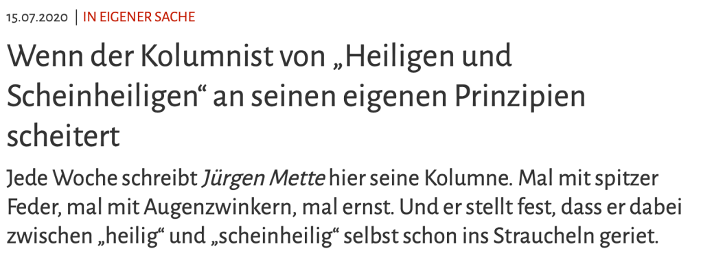 Was passiert, wenn es passiert? Wird Mette sich wegducken, schweigen, erklären, angreifen …? Jürgen Mette zeigt Profil! In seiner nächsten Kolumne geht er öffentlich, konkret, ehrlich und klar damit um. Das ist ganz großes Kino in meinen Augen. Auch diesen Text sollte man selbst lesen. Hier ist er verlinkt.