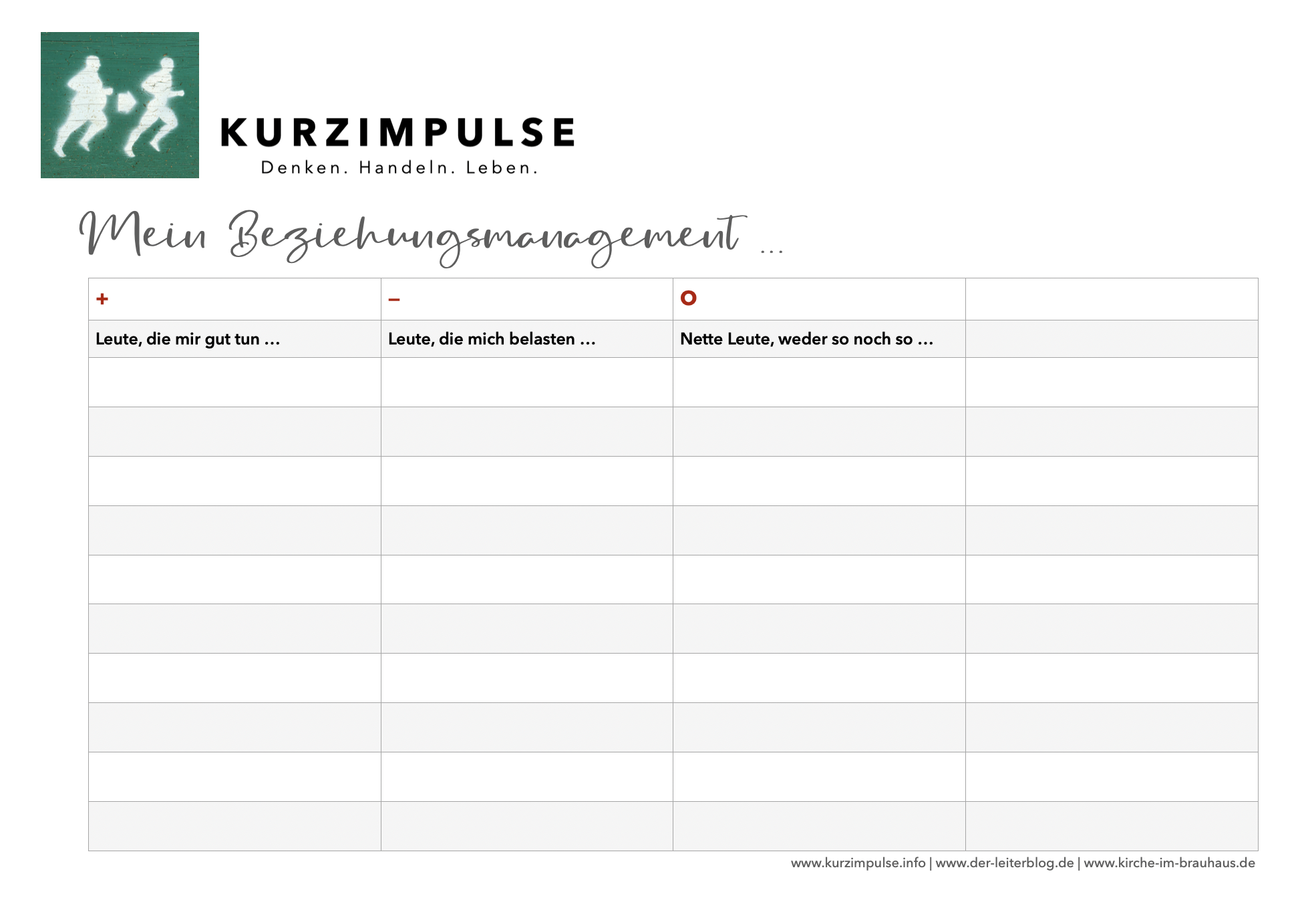 - Dann gehe die Namen durch und ordne die Namen in eine der Spalten. Bringen diese Leute Dich voran? Inspirieren sie Dich usw. Oder eher das Gegenteil? Oder weder noch?