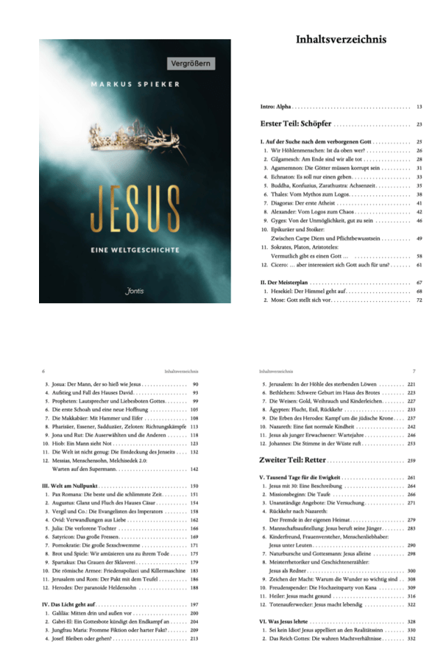 In der Vorstellung des Buches lesen wir diesen Text: „Sieben Jahre hat Markus Spieker an seinem monumentalen Jesus-Buch gearbeitet. Nun legt er eine Christus-Biographie vor, wie es noch keine gab. Auf mehr als 1000 Seiten erzählt er die Geschichte von Jesus als welthistorisches Epos: von den Anfängen der Zivilisation bis zur Corona-Krise. Den Schwerpunkt der Darstellung bildet das Leben des Messias bis zur Passion und Auferstehung sowie die Ausbreitung des Evangeliums im 1. Jahrhundert.“