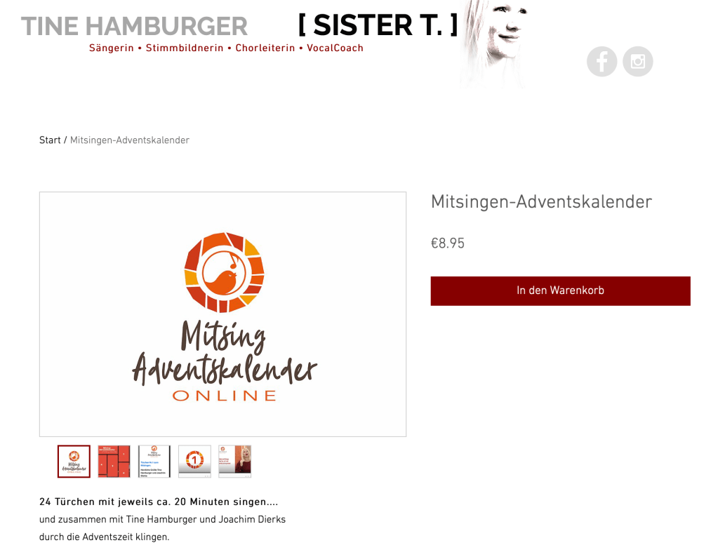 Tine Hamburger, eine leidenschaftliche Gospel-Sängerin hat einen Mitsing-Adventskalender Online vorbereitet, der Gospelbegeisterten eine super Möglichkeit Corona-Konform bietet, jetzt der Leidenschaft dennoch nachzugehen. Der kleine Obolus für das Angebot geht voll in Ordnung, Künstler haben es aktuell besonders schwer!!! Einfach aufs Bild klicken und schon kommst Du zum Angebot. Und dieses Special besteht darüber hinaus: man kann den Adventskalender auch an Freunde und Familie verschenken!