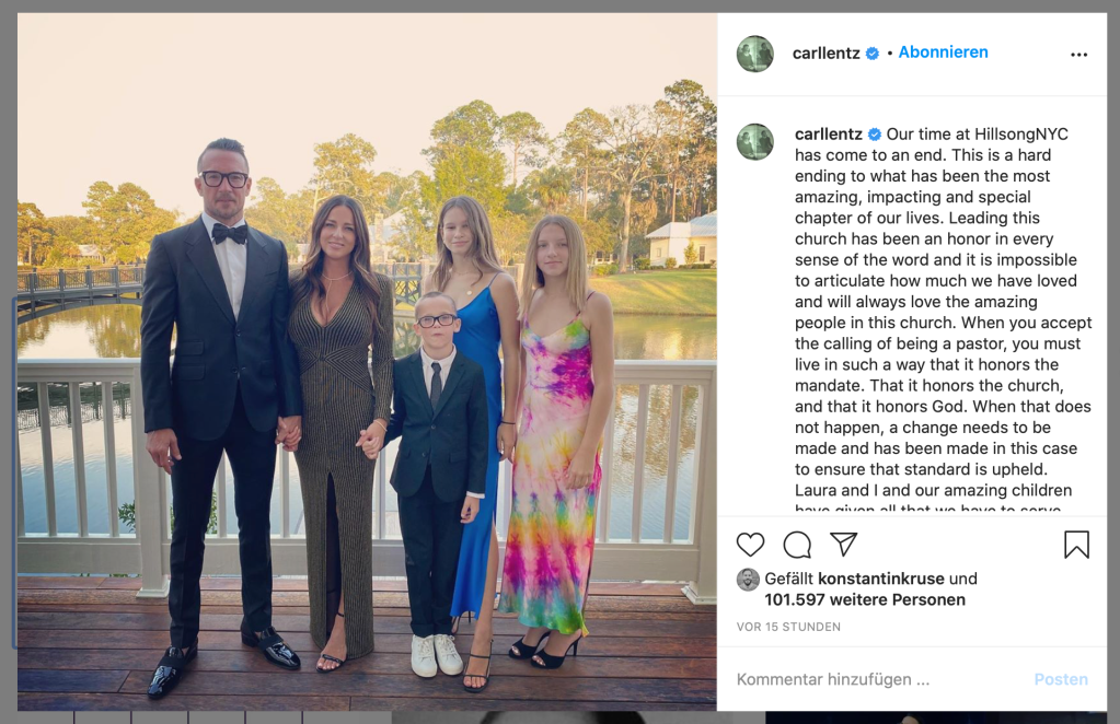 »Our time at HillsongNYC has come to an end. This is a hard ending to what has been the most amazing, impacting and special chapter of our lives. Leading this church has been an honor in every sense of the word and it is impossible to articulate how much we have loved and will always love the amazing people in this church. When you accept the calling of being a pastor, you must live in such a way that it honors the mandate. That it honors the church, and that it honors God. When that does not happen, a change needs to be made and has been made in this case to ensure that standard is upheld. Laura and I and our amazing children have given all that we have to serve and build this church and over the years I did not do an adequate job of protecting my own spirit, refilling my own soul and reaching out for the readily available help that is available. When you lead out of an empty place, you make choices that have real and painful consequences. I was unfaithful in my marriage, the most important relationship in my life and held accountable for that. This failure is on me, and me alone and I take full responsibility for my actions. I now begin a journey of rebuilding trust with my wife, Laura and my children and taking real time to work on and heal my own life and seek out the help that I need. I am deeply sorry for breaking the trust of many people who we have loved serving and understand that this news can be very hard and confusing for people to hear and process. I would have liked to say this with my voice, to you, in person because you are owed that. But that opportunity I will not have. So to those people, I pray you can forgive me and that over time I can live a life where trust is earned again. To our pastors Brian and Bobbie, thank you for allowing us to lead, allowing us to thrive and giving us room to have a voice that you have never stifled or tried to silence. Thank you for your grace and kindness especially in this season, as you have done so much to protect and love us through this. We, the Lentz family, don’t know what this next chapter will look like, but we will walk into it together very hopeful and grateful for the grace of God..«