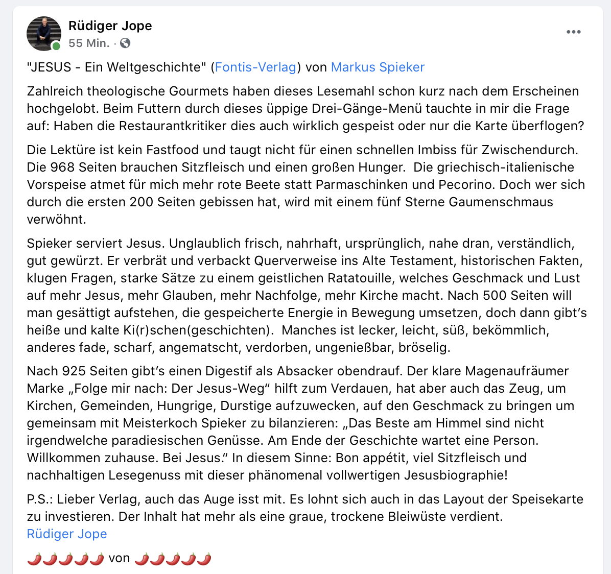 Jesus – ein Weltgeschichte von Markus Spieker. Mittlerweile vielfach besprochen, gelobt und empfohlen. Und das zurecht. Passt zudem zu Weihnachten. Jesus ist ja – streng genommen – der Anlass für das Fest. Eine sprachlich tolle Rezi hat Rüdiger Jope, Chefredakteur im SCM Verlag, auf seinem Facebook-Kanal gepostet. Toll.