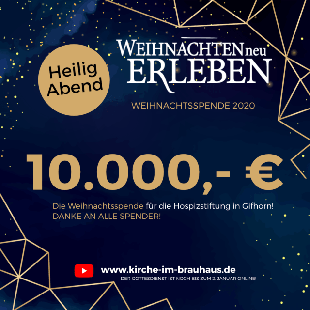 - Wir starten eine Aktion für die Weihnachtsspende 2020 der Kirche, die in vollem Umfang dem Hospiz Gifhorn zukommen wird. Wir haben ein Video produziert, um den Zuschauern des Heiligabend Gottesdienstes und darüber hinaus das Anliegen nahe zu bringen: