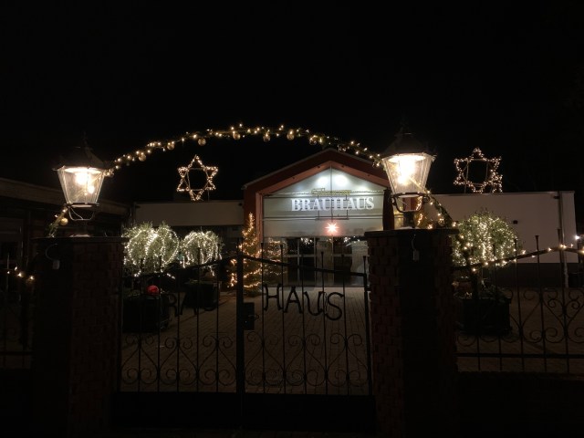 - Unser Brauhaus ist eine tolle Chance. Das ist eine Besonderheit für uns in Gifhorn. Wir haben es also weihnachtlich geschmückt und in Licht getaucht. Unten könnt ihr ein Bild vom Eingangsbereich sehen. Das ganze Haus ist toll geschmückt und ein „Hingucker“ mitten in der Stadt.