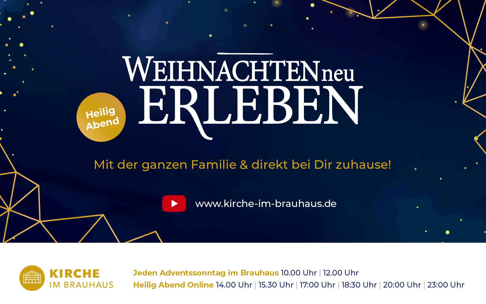 - Wir investieren richtig viel Zeit, Kraft, Kreativität, externe Kompetenz und Geld in einen Online-Weihnachtsgottesdienst, der das „Brauhaus-Feeling“ transportiert und die großartigste Geschichte der Menschheit erzählt. Das ist die Prio 2020. Er wird zu sechs Zeiten auf unserem YouTube Kanal gestreamt.