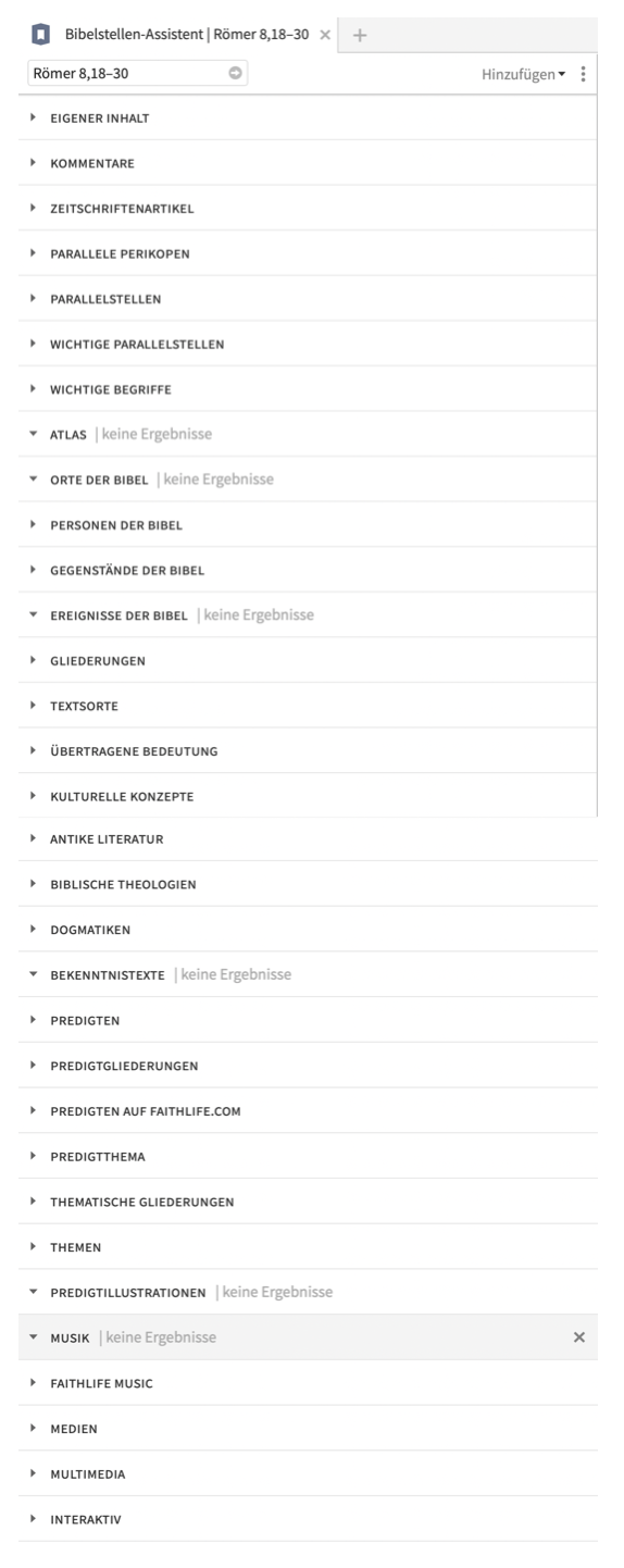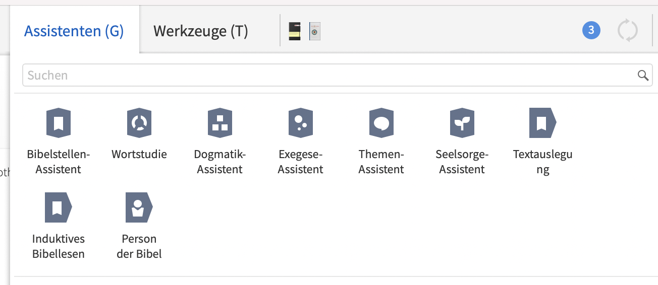 Die Namen der Assistenten zeigen das Spektrum, mit dem gesucht werden kann. Dabei stellt mir Logos aus allen Werken, die ich in Logos besitze, die relevanten vorhanden Informationen zusammen. Weiter individuelle Einstellung sind darüber hinaus möglich. Diese Flexibilität wäre ein eigenes Thema.