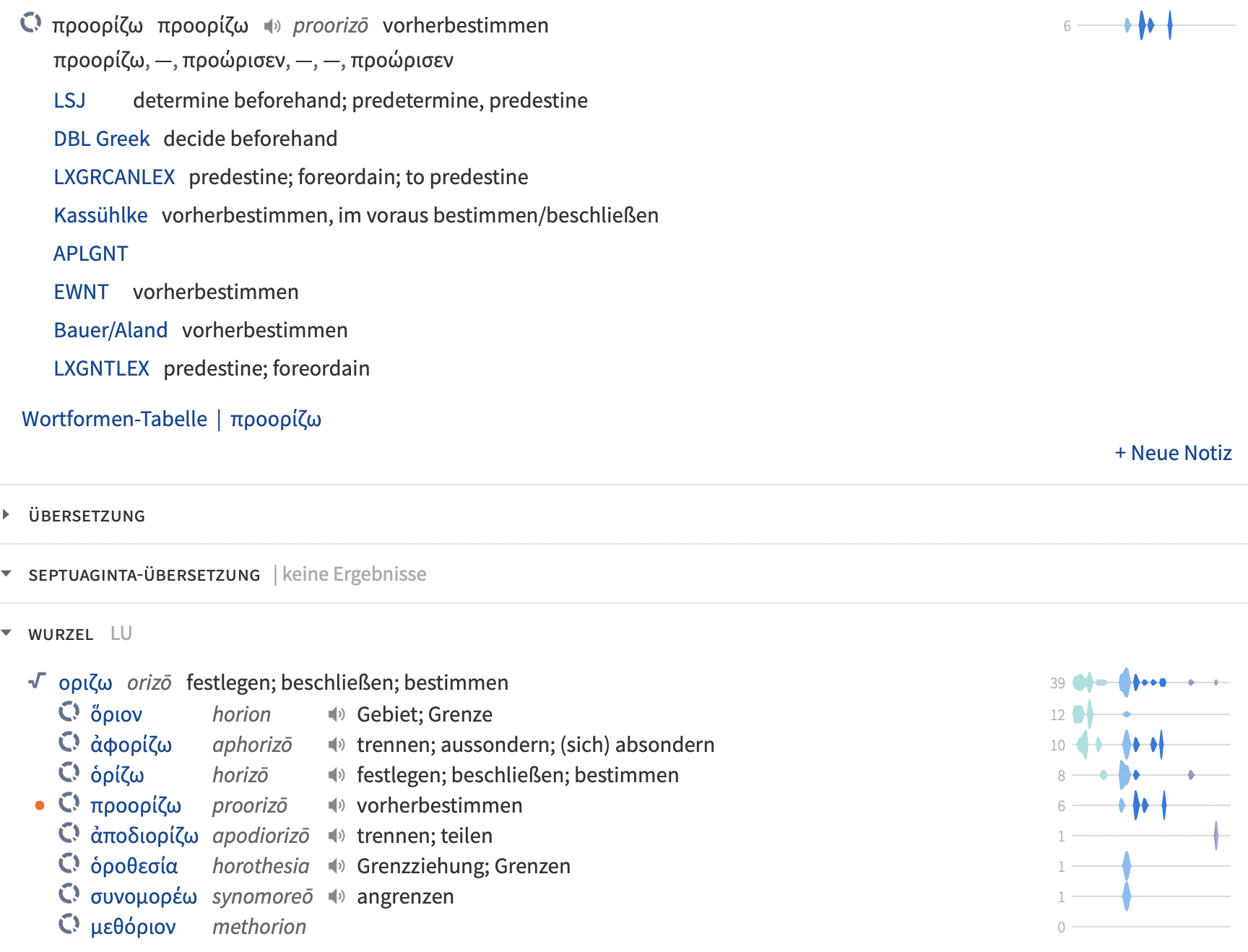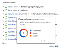 Und ich möchte mehr erfahren.Was tun? Ein Klick auf die griechische Vokale bahnt den Weg. Jeder blaue Begriff lädt mich zur Vertiefung ein. Ich kann mir die Vokabel auch akustisch ausgeben lassen. Oder mir alle Stellen anzeigen lassen, an denen der Begriff im Grundtext zu finden ist. Ganz gleich, wie er in meiner Lieblingsübersetzung wiedergegeben wird. Oder, oder, oder …