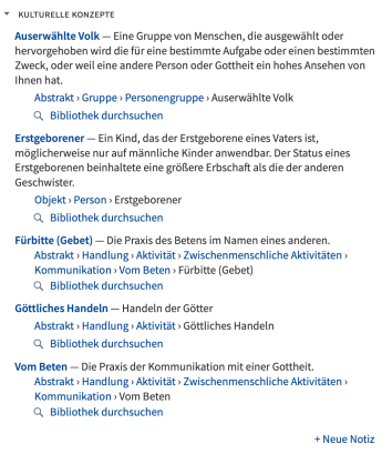Oft interessieren mich aber auch die kulturellen Konzepte, die die Autoren im Hinterkopf der Bibel im Sinn hatten. Hier ein Beispiel aus meiner Passage. Alles was blau ist ist klickbar und führt mich immer tiefer.