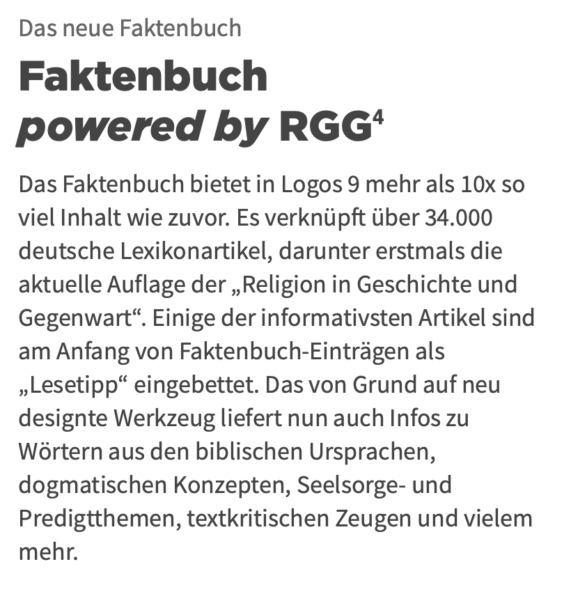 Das Faktenbuch der Software basiert zum Beispiel auf den 22.000 Artikeln des RGG4! Insgesamt bilden 34.000 deutsche Lexikonartikel die Grundlage. Viele weitere Standardwerke der Theologie sind bereits jetzt verfügbar. Ständig kommen neue deutschsprachige Reihen, Bücher, Kommentare und Lexika hinzu. Logos hat sich so viel Vertrauen in den letzten Jahren verdient, dass viele renommierte Verlage mit Logos ihre Werke digitalisieren und zur Verfügung stellen.