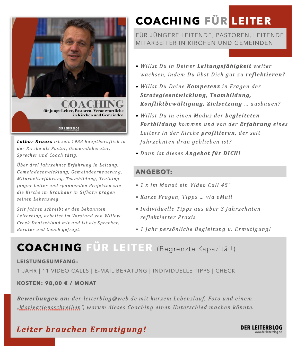 Ermutigung, Begleitung, konstruktiv-kritische Reflexion … Geschenke, durch die Führungskräfte in ihrer Berufung gesund wachsen! Keiner kann darauf verzichten. Punkt. Seit über drei Jahrzehnten erlebe ich das „am eigenen Leib“ und seit mehr als zwei Jahrzehnten gebe ich es an die nächste Generation von Leitern weiter. Das ist ein Stück meiner Lebensaufgabe. Ich liebe sie.