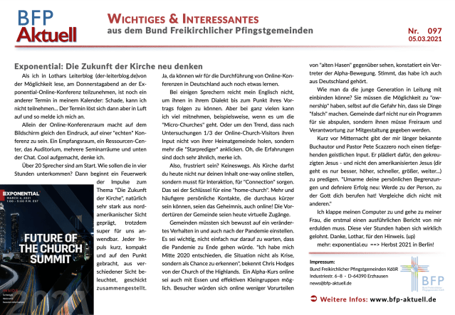 Normalerweise würden sich etwa 5000 Leiter in Orlando zur Exponential Konferenz treffen, wie das seit vielen Jahren der Fall ist. Dave Ferguson, der Präsident von Exponential, ist ja auch in Deutschland kein Unbekannter mehr. Die Pandemie verhindert die klassische Konferenz und schafft so Raum für dieses neue Format, an dem wir auch aus unserer Region entspannt teilnehmen können.