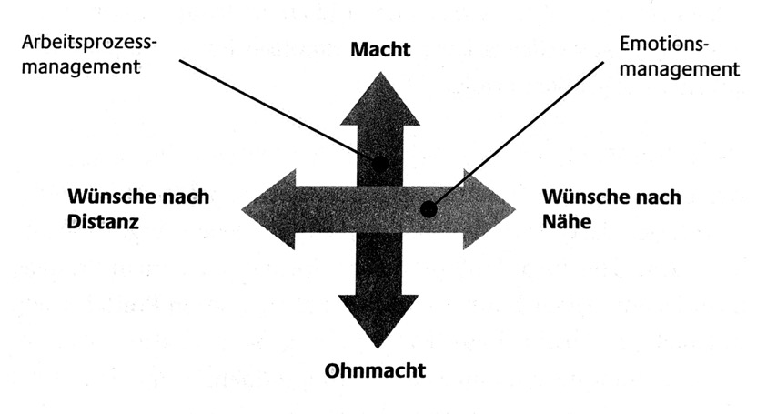 Wie in allen Gruppenprozessen taucht auch im Teamprozess das Spannungsfeld zwischen Nähe vs. Distanz und Dauer vs. Wechsel auf! (Beschrieben bei Riemann/Thomann Modell). Gleich zu beginn führt er sprachlich prägnant die Typen: Teamflüchter und Teamsucher ein. Sie verfolgen unterschiedliche Ideen und bringen unterschiedliche Bedürfnisse mit. Daraus entstehen soziale Konflikte. Diese Unterschiedlichkeit zu verstehen, ist ein Grundbaustein, um die Emotionen in Teamkonflikten zu verstehen und mit ihnen umgehen zu lernen.