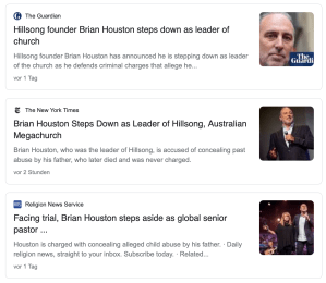 Die Polizei behauptet, dass Houston seit September 1999 wusste, dass sein Vater Frank Houston 1970 einen Mann unsittlich angegriffen hatte. Und dann eben nicht verantwortlich reagiert hätte. Brian Houston sieht das ganz anders. Schon im letzten September war er von vielen Rollen in der Kirche zurückgetreten. In der Verantwortung als „Global Senior Pastor“ war er verblieben. Anfang Oktober kam es zu einer ersten Anhörung. Nun hat sich die Sache so entwickelt, dass Houston sich ganz auf die Verteidigung seiner Person konzentrieren muss.