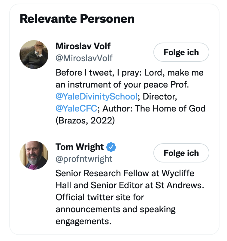 Volf und Wright haben einen Aspekt miteinander besprochen, der durch Tim Keller, aber auch Luther, Calvin … als ein Grundproblem des Menschen ausgemacht wurde: der Götzendienst. Hier ein Auszug vom Twitter Account von Miroslav Volf: