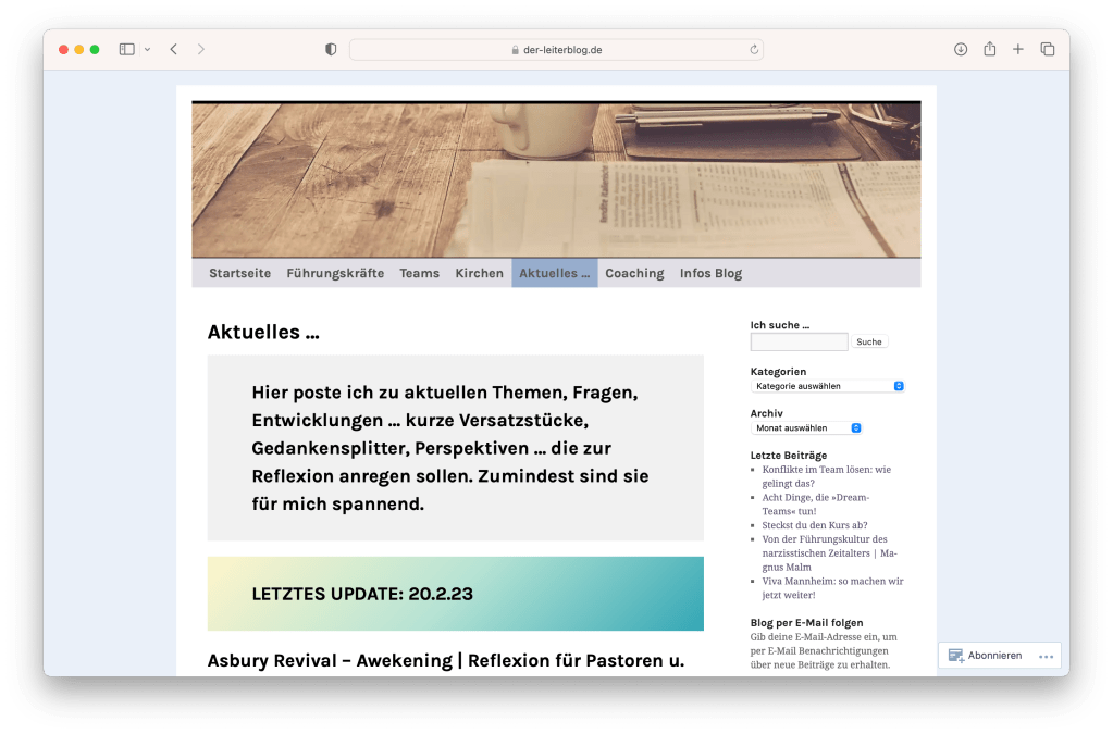 Die zweite Rubrik trägt den Namen „Aktuelles …“. Hier kommen kurze Infos und Reflexionen, die es nicht in den normalen Post auf dem Leiterblog schaffen, aber dennoch interessant sind.