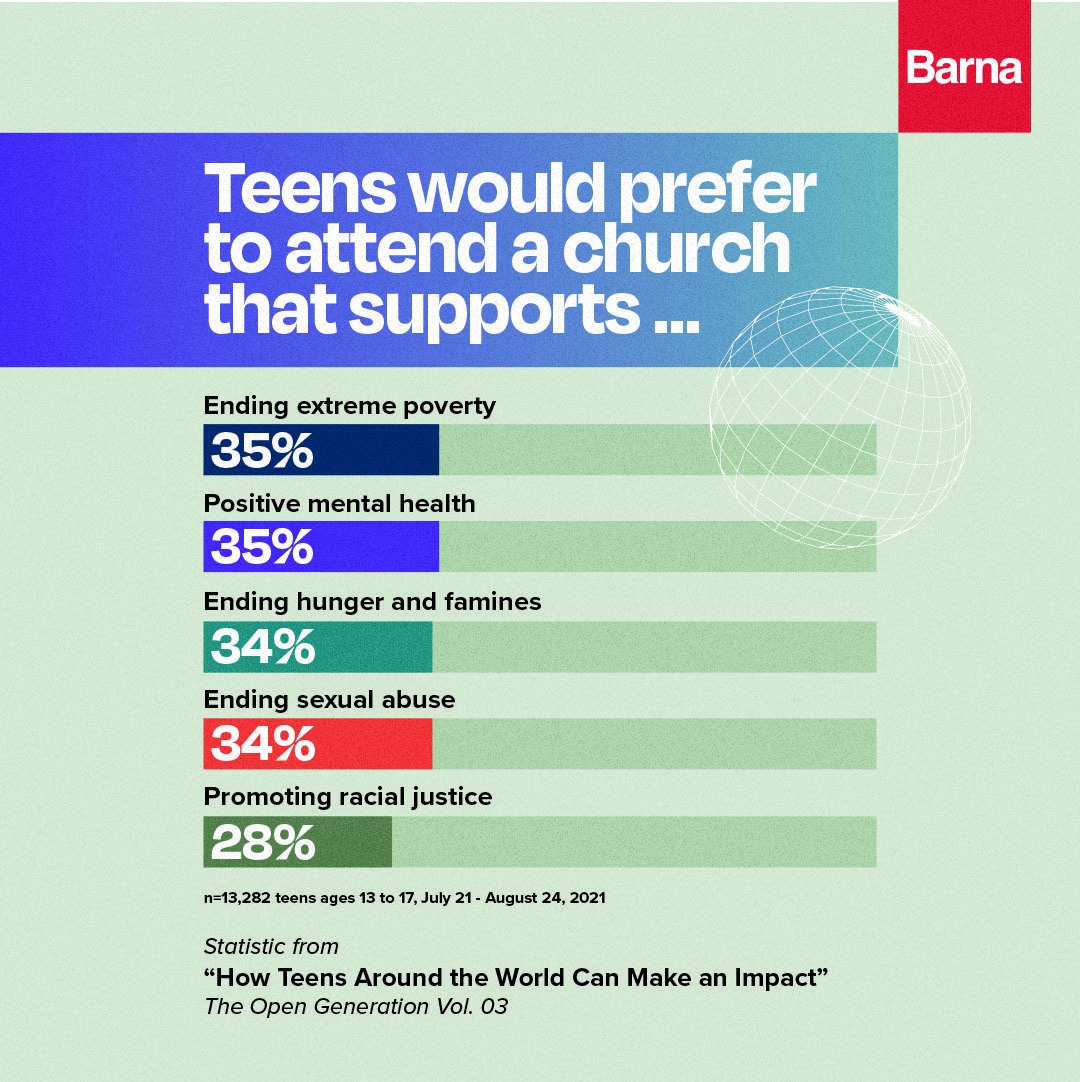 Barna bat über 13.000 Jugendliche gebeten, diesen Satz zu vervollständigen: „Ich würde es vorziehen, eine Kirche zu besuchen, die … unterstützt“. Hier die Ergebnisse: